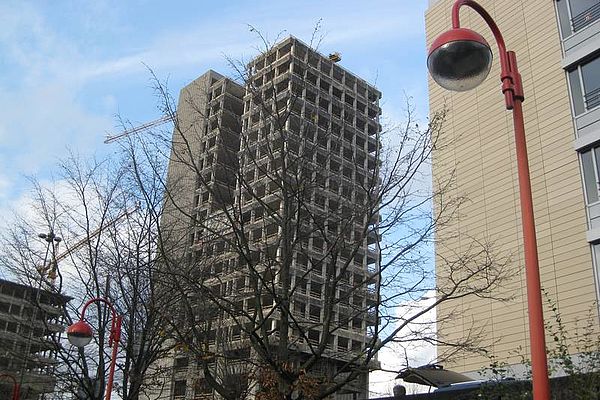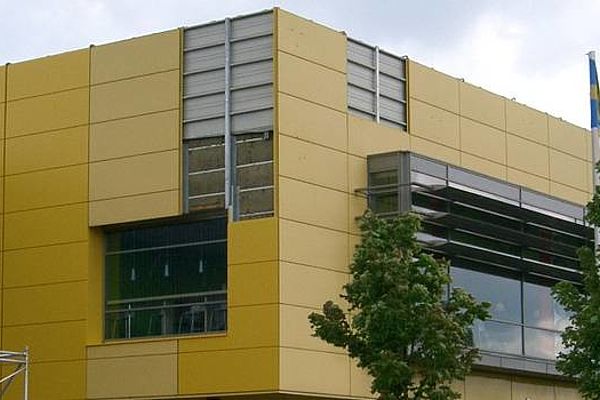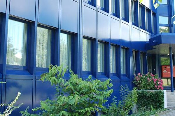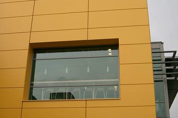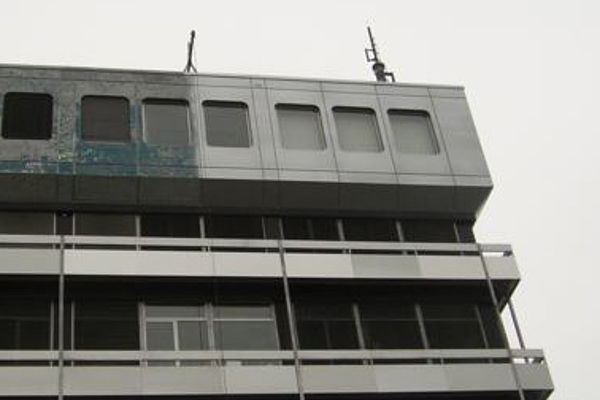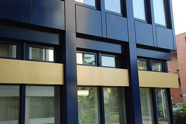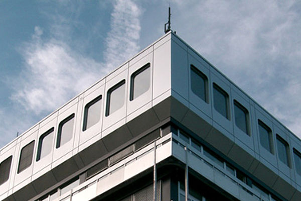 Nach einem weiteren Schritt in der Vorbehandlungsanlage wurden die Bleche mit dem Einbrennlacksystem Duraflon genau wie Neubleche beschichtet. Fenster und Fassadenkonstruktionsteile, die nicht abgebaut werden konnten, wurden vor Ort vorbehandelt und mit dem luftrocknenden 2-K-Duraflon-Reperaturlack überlackiert.